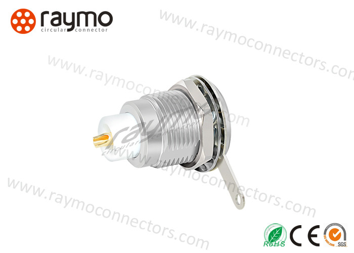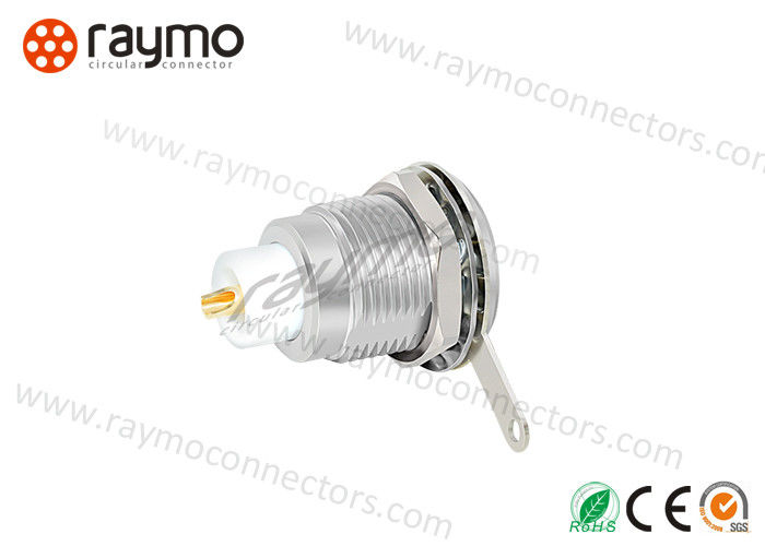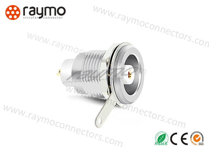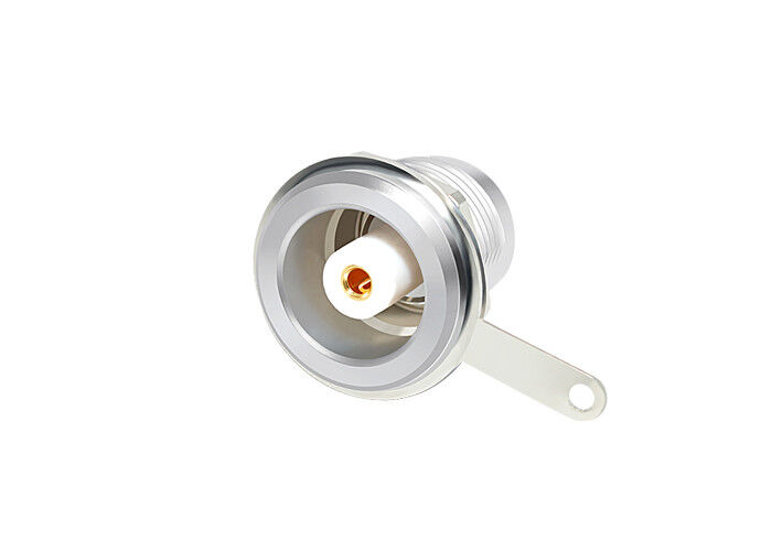 مقبس ثابت، تثبيت بصمولة، سلسلة 00S، نوع متعدد الأقطاب مع جهات اتصال محورية 50 أوم، غلاف خارجي من النحاس المطلي بالكروم، عازل PPS |